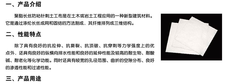 長(zhǎng)絲土工布(hatching eclosion)長(zhǎng)絲土工布的國(guó)家標(biāo)準(zhǔn)GB/T 17639-1998土工合成材料長(zhǎng)絲防粘針刺非織造土工布,標(biāo)準(zhǔn)GB/T 17639—2008。